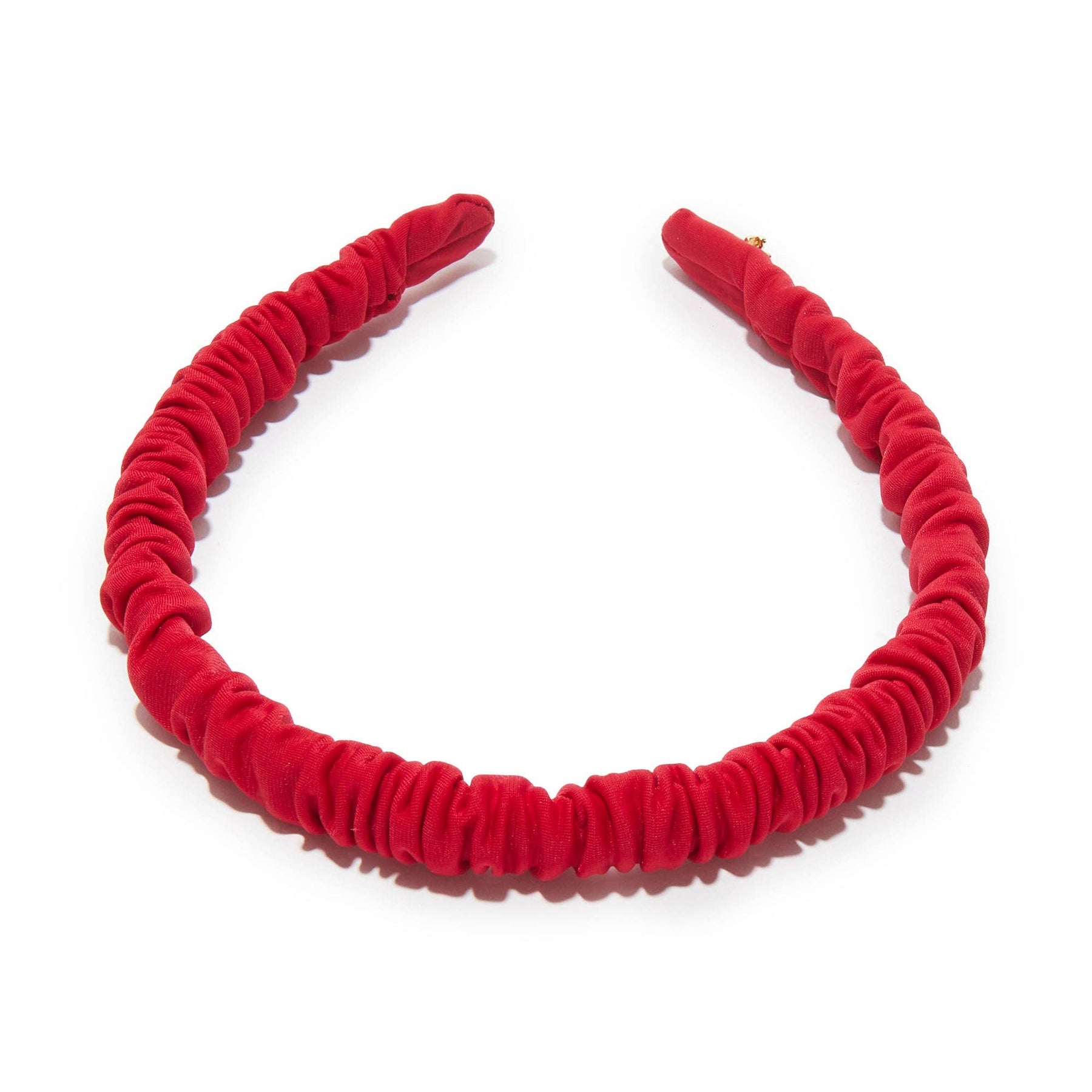 Our slim scrunchie silhouette. ∙ Scarlet ruched neoprene ∙ 1/2" comfort fit width band ∙ Trademark logo charm ∙ Spot clean, store in custom cloth pouch Lele Sadoughi headbands are made with our custom fit band. Designed in NYC and made with quality fabrics and unique hand sewn trims