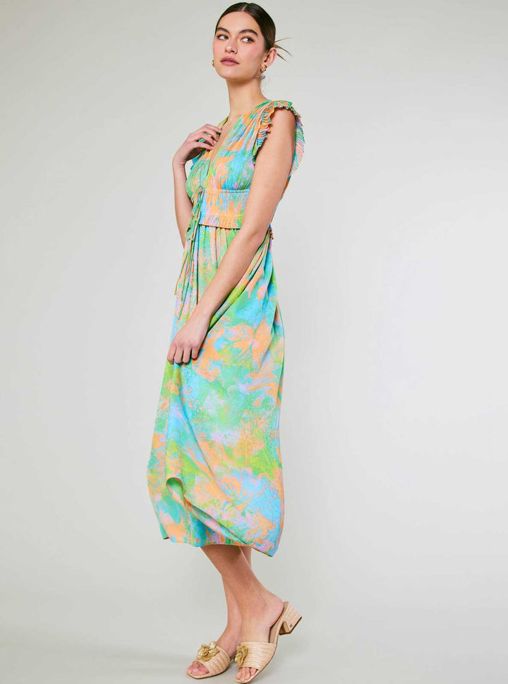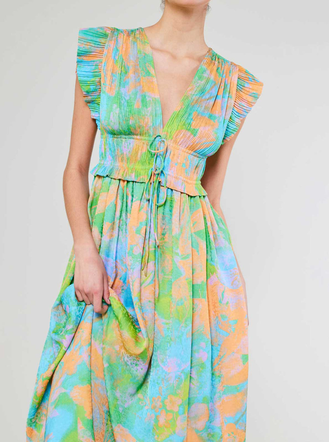 Pleated Flutter Sleeve Neck With Tie Elastic Waisted Long Dress With Pleated Top
