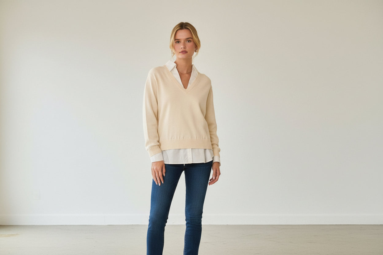 Layered Look V - Neck Mixed Media Sweater: Ivory - White - The Color Collab