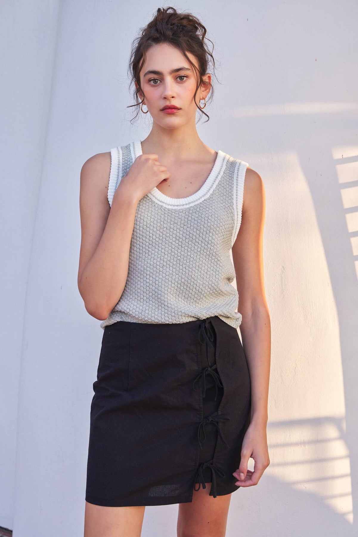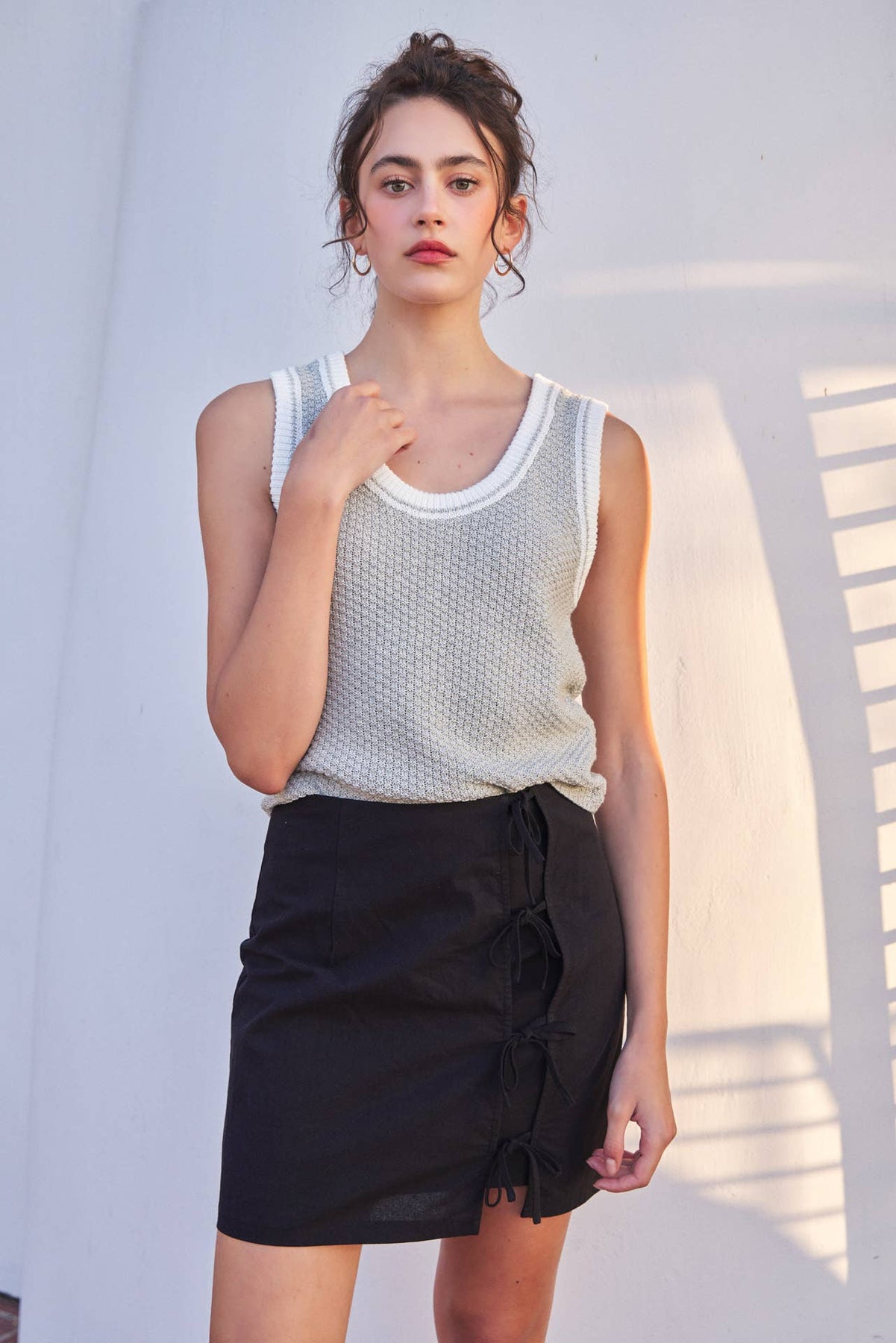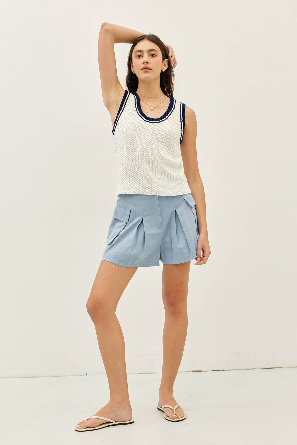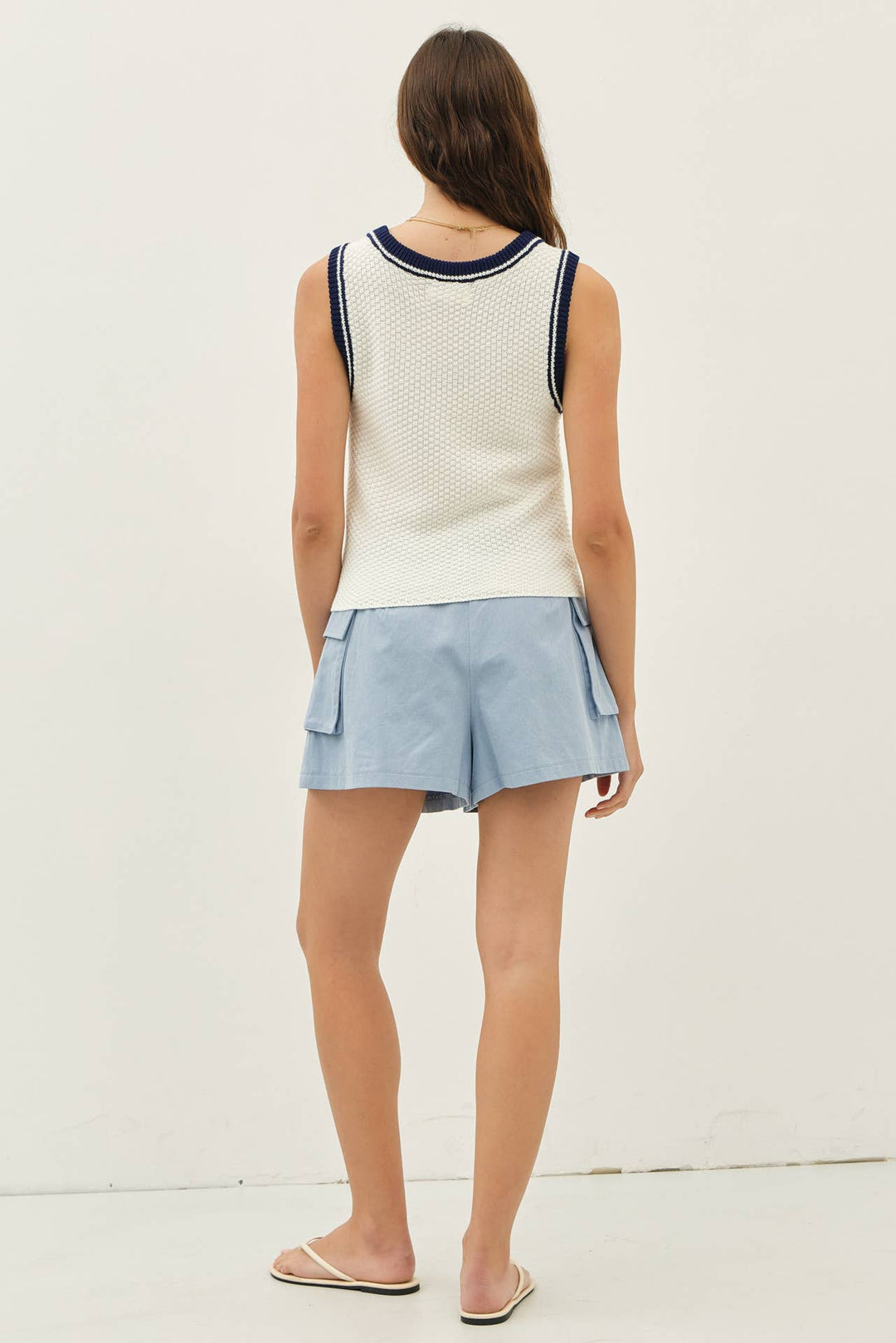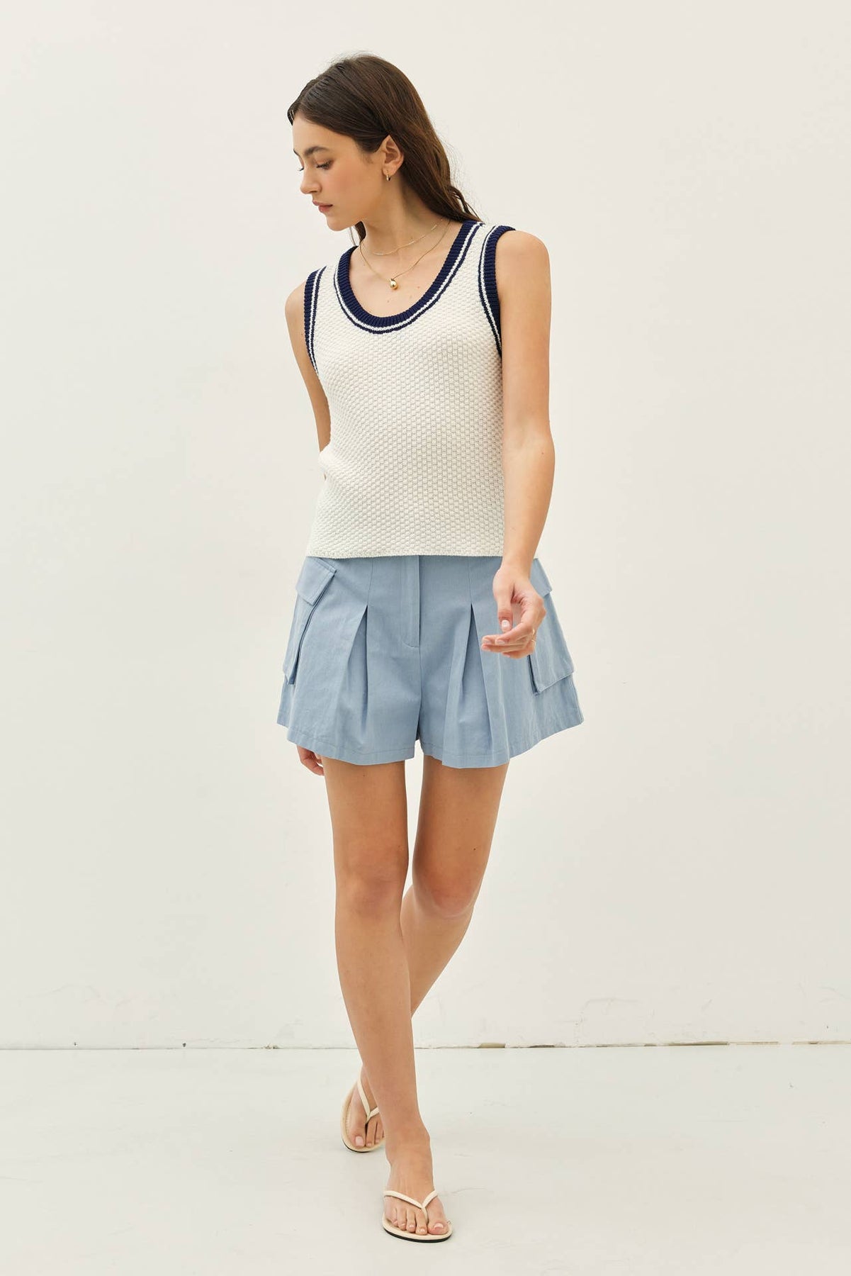 Textured sweater fabric - Knit tank top - Contrast rib at the neckline and armholes - Scoop neck Contents. Cream/Navy - Summer/Autumn