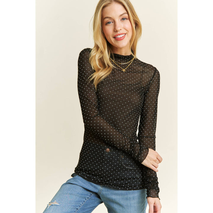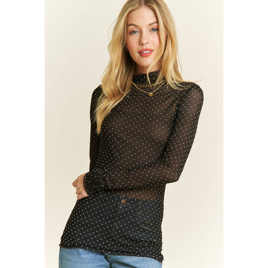 Embrace the playful and chic look of polka dots with this Black Polka-Dot Mesh Long Sleeve Top! The soft mesh fabric offers a comfortable stretch, while the high neck and long sleeves with thumb-holes add a unique touch. This top features a slim fit that flatters any figure, and is perfect for a day or night out. Don't wait, add this must-have piece to your wardrobe today!